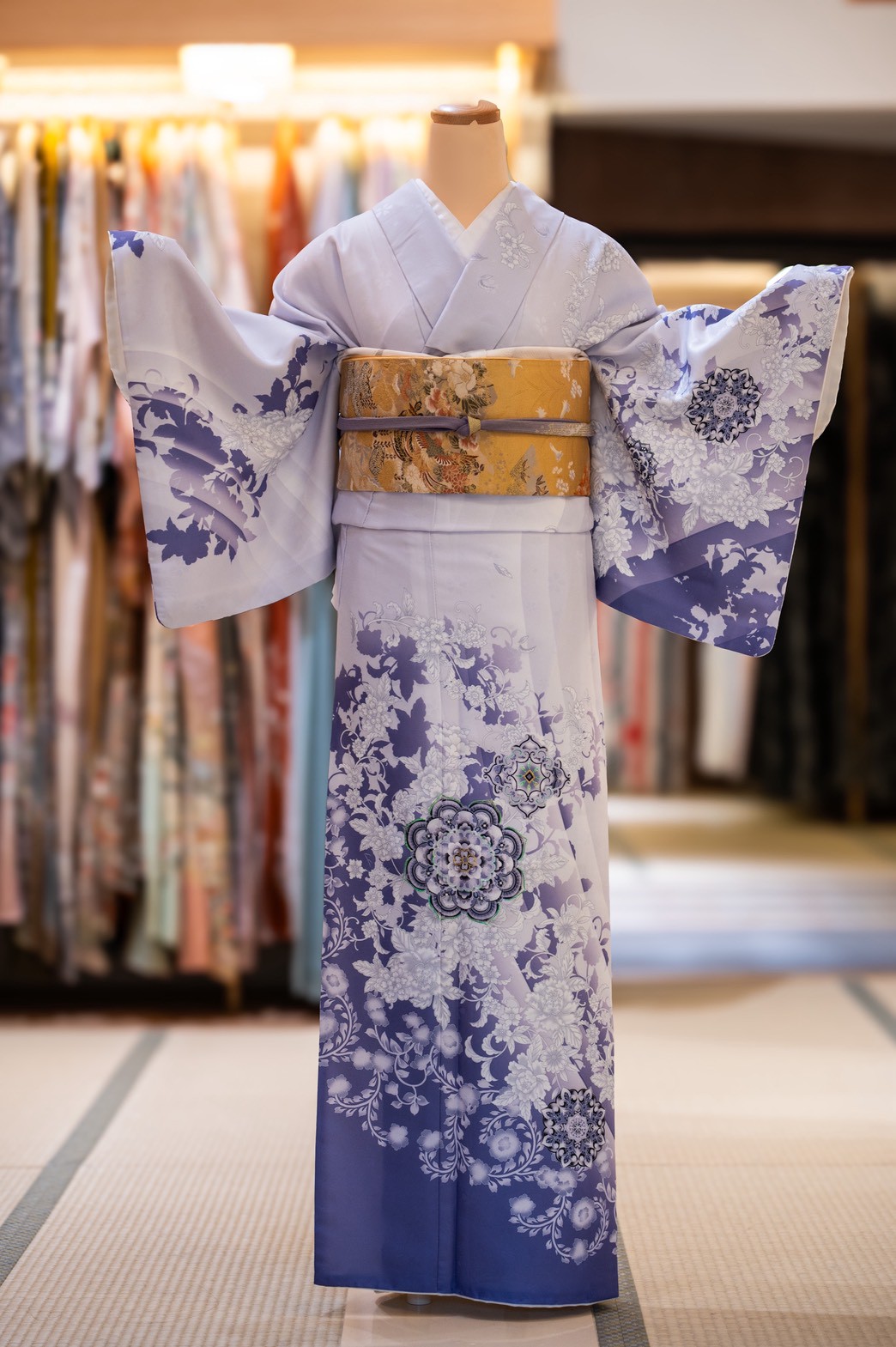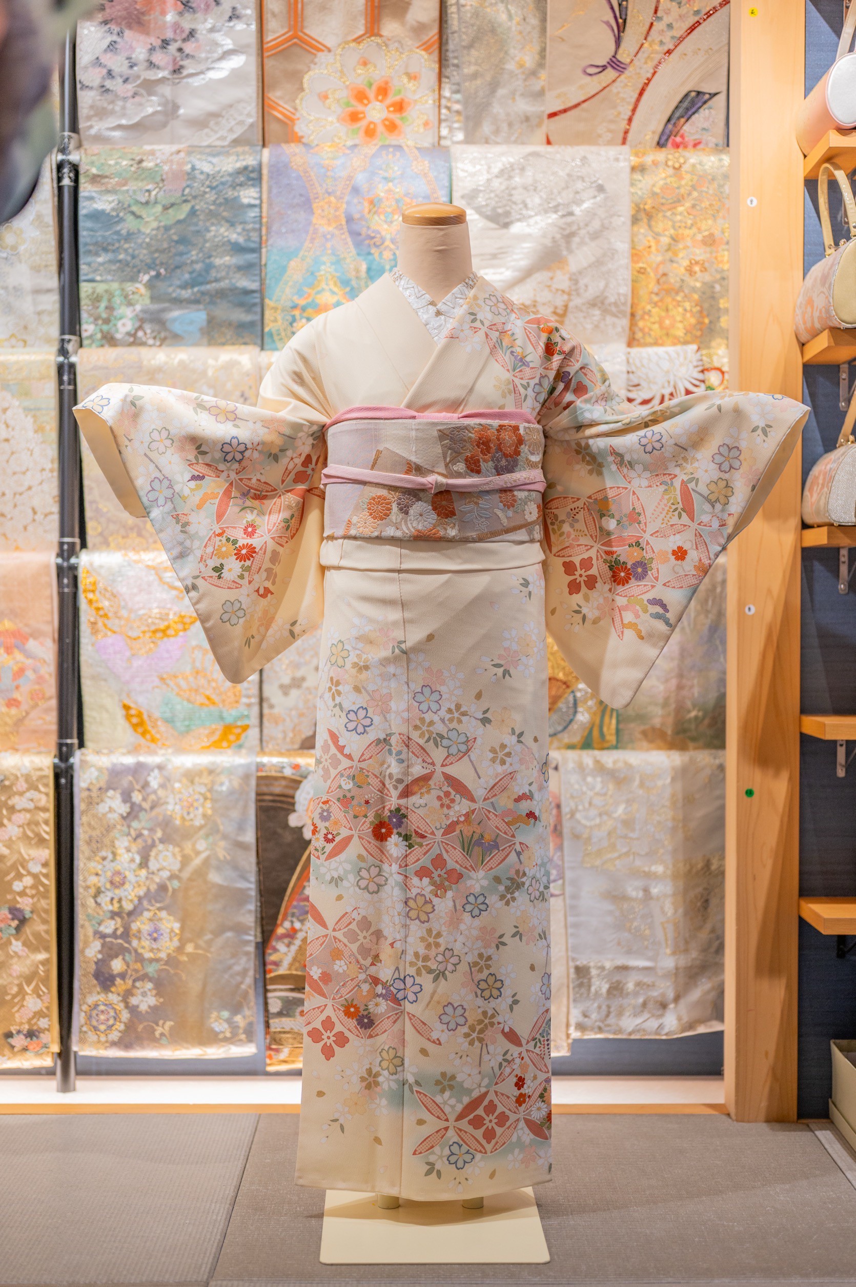 和服方案選擇 高級訪問服方案 高級訪問著 正裐製成的訪問著,其質感與體感都是一等一和服介绍 訪問服是一種介於正式與日常之間的和服,適合參加結婚典禮、茶會或拜訪時穿著。它比振袖和服稍微簡約,但依然具備華麗與正式的特點。訪問服的材質多選用絲質或正絹,觸感舒適且柔軟,適合長時間穿著。圖案方面,訪問服的設計較為穩重且低調,通常以染織技術呈現精緻的花卉或季節性圖案,布料上有和諧的紋樣展現出和諧與典雅的美感。訪問服與振袖一樣講究腰帶的結法與和服的層次搭配,使穿著者既得體又具高雅氣質,適合多種場合。
